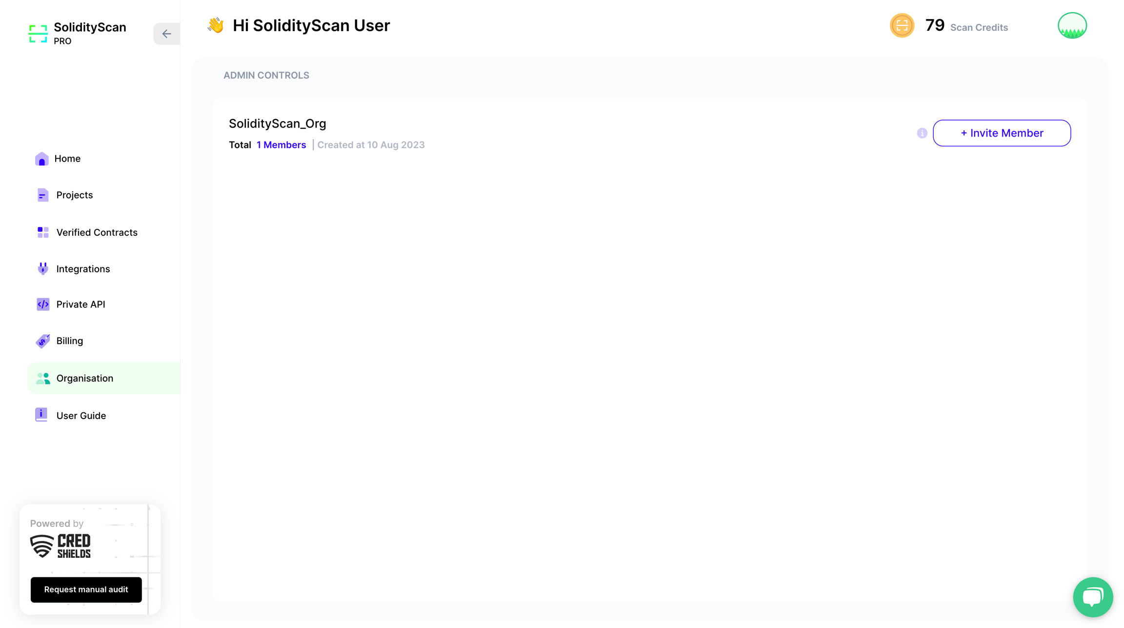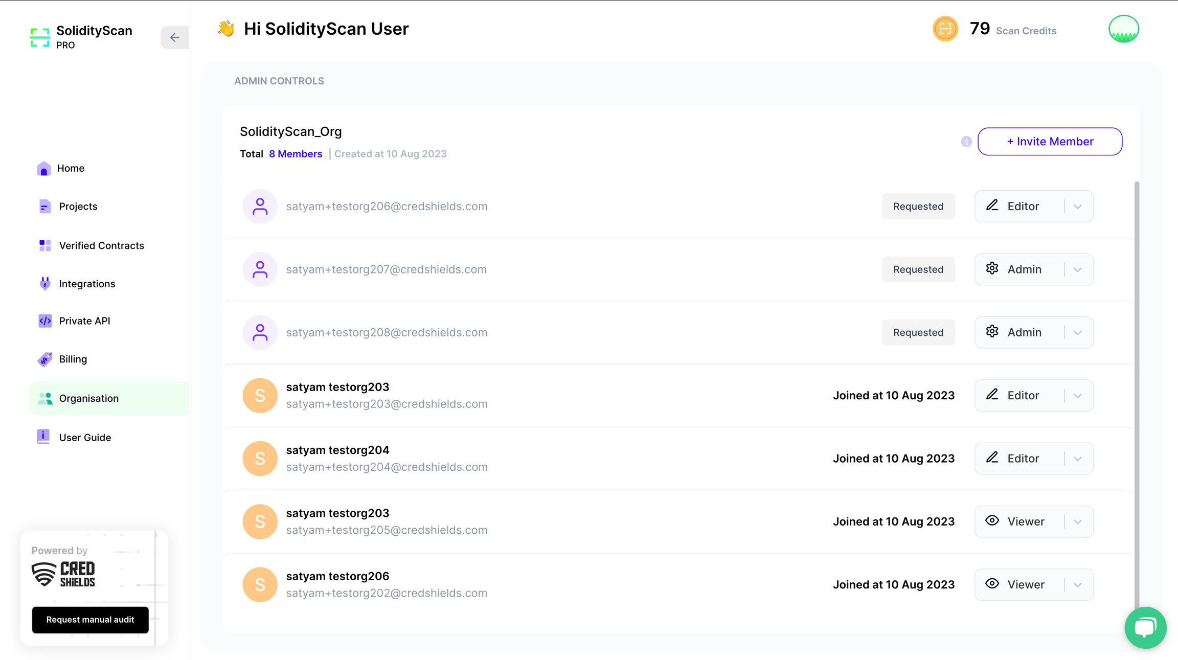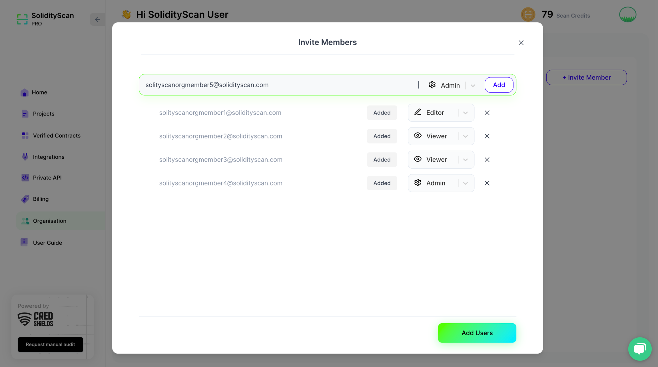 SolidityScan platform provides the feature to create and manage Organizations. You can add users to your organization and assign them roles based on the resource access you want the users to have.