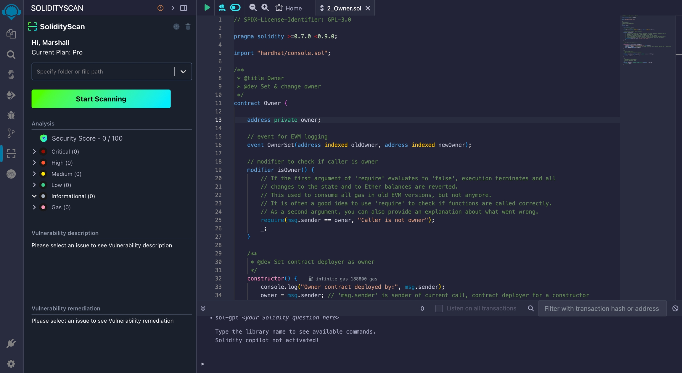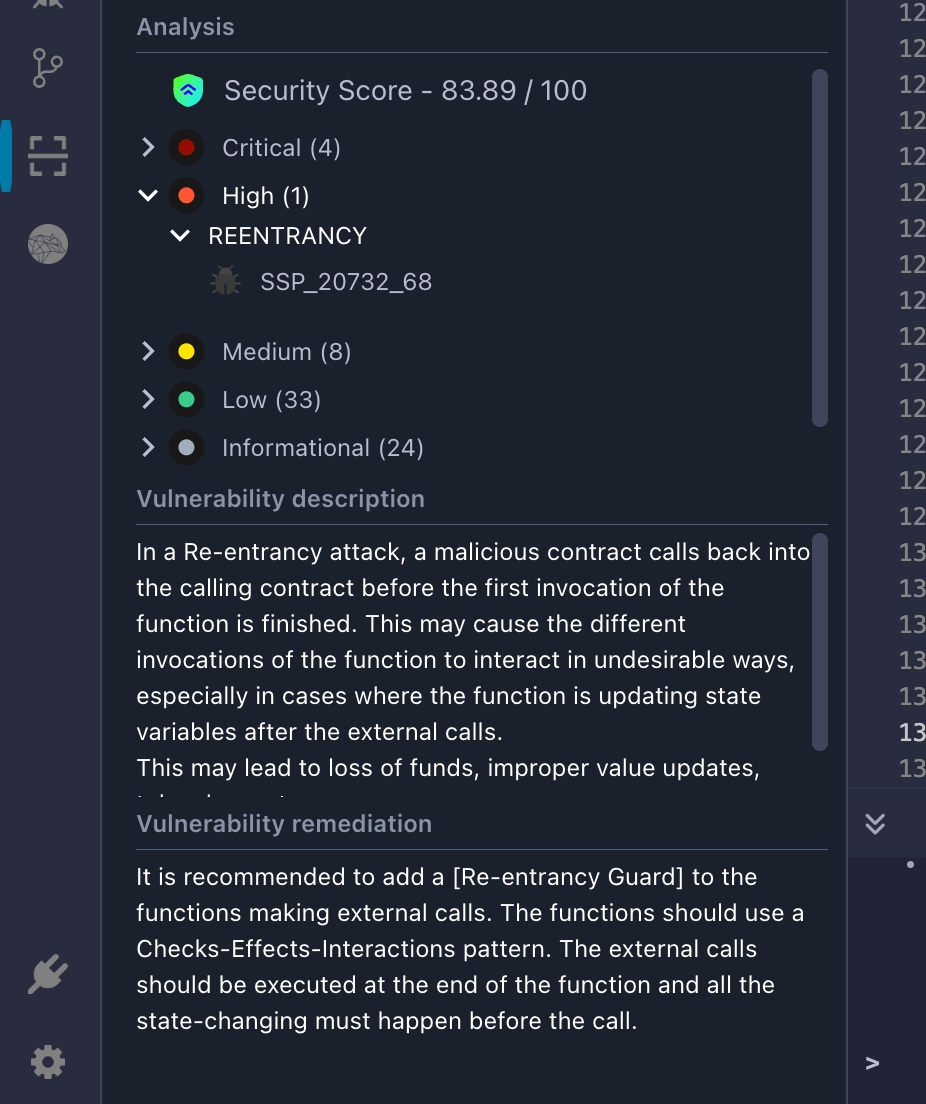 SolidityScan Remix plugin provides scanning capabilities for Solidity smart contracts. It allows you to scan a single .sol file, folder or an entire workspace and gives a security profile for your contract with a security score, vulnerability distribution according to criticality levels & highlights the lines of code containing the vulnerabilities.