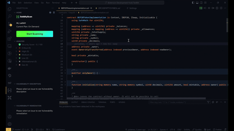 SolidityScan has a Visual Studio Code extension that provides scanning capabilities for Solidity smart contracts. It allows you to scan a single .sol file or an entire workspace and gives a security profile for your contract with a security score, vulnerability distribution according to criticality levels & highlights the lines of code containing the vulnerabilities.